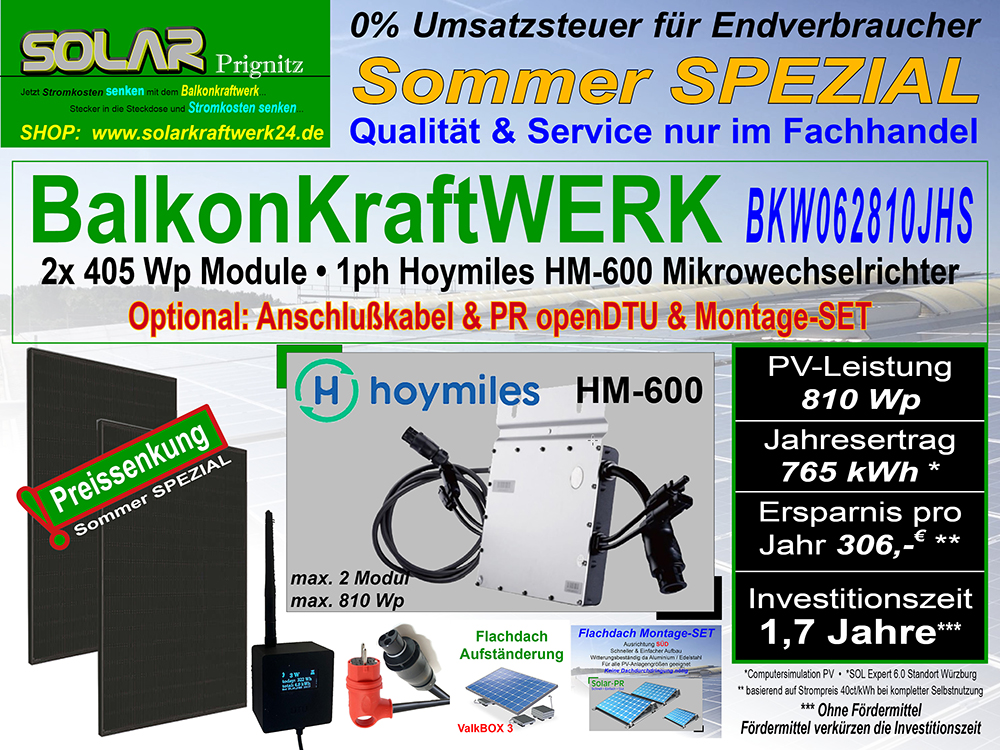 Dieses Angebot enthält 0% Mehrwertsteuer und ist daher für PV-Anlagen unter 30 kW Peak für die wohnungsnahe Errichtung und private oder öffentliche Nutzung bestimmt. Kein gewerblicher Weiterverkauf. Eine Lieferung mit 0% Mehrwertsteuer erfolgt nur, wenn Sie als Kunde mit dem Kauf bestätigen, dass die gesetzlichen Rahmenbedingungen hierfür erfüllt sind. Wir behalten uns vor fällige Mehrwertsteuer-Beträge nachzufordern, falls Leistungen nach der neuen Gesetzgebung anscheinend nicht mit 0% Mehrwertsteuer nach § 12 Abs. 3 UStG zu berechnen sind.